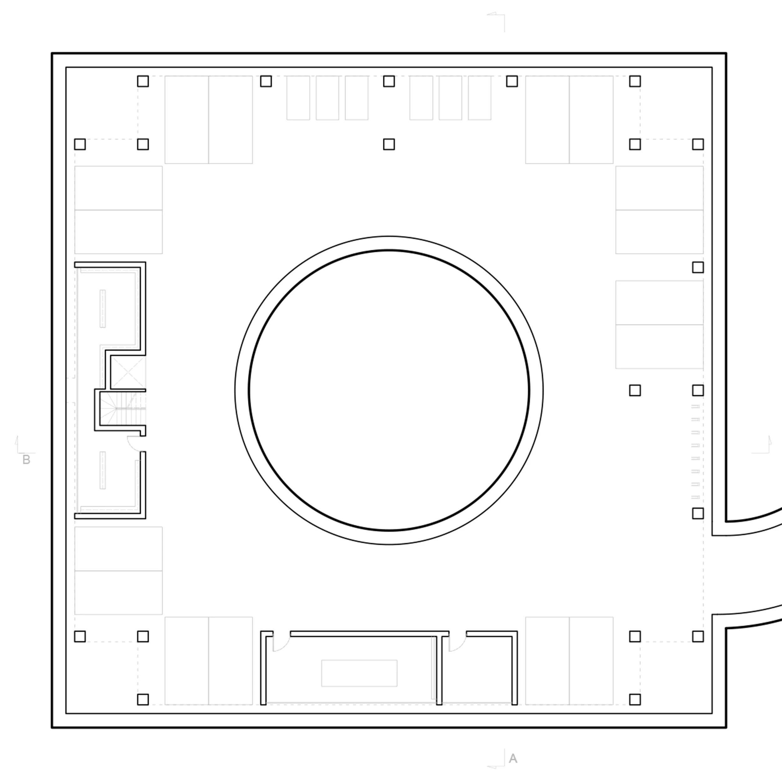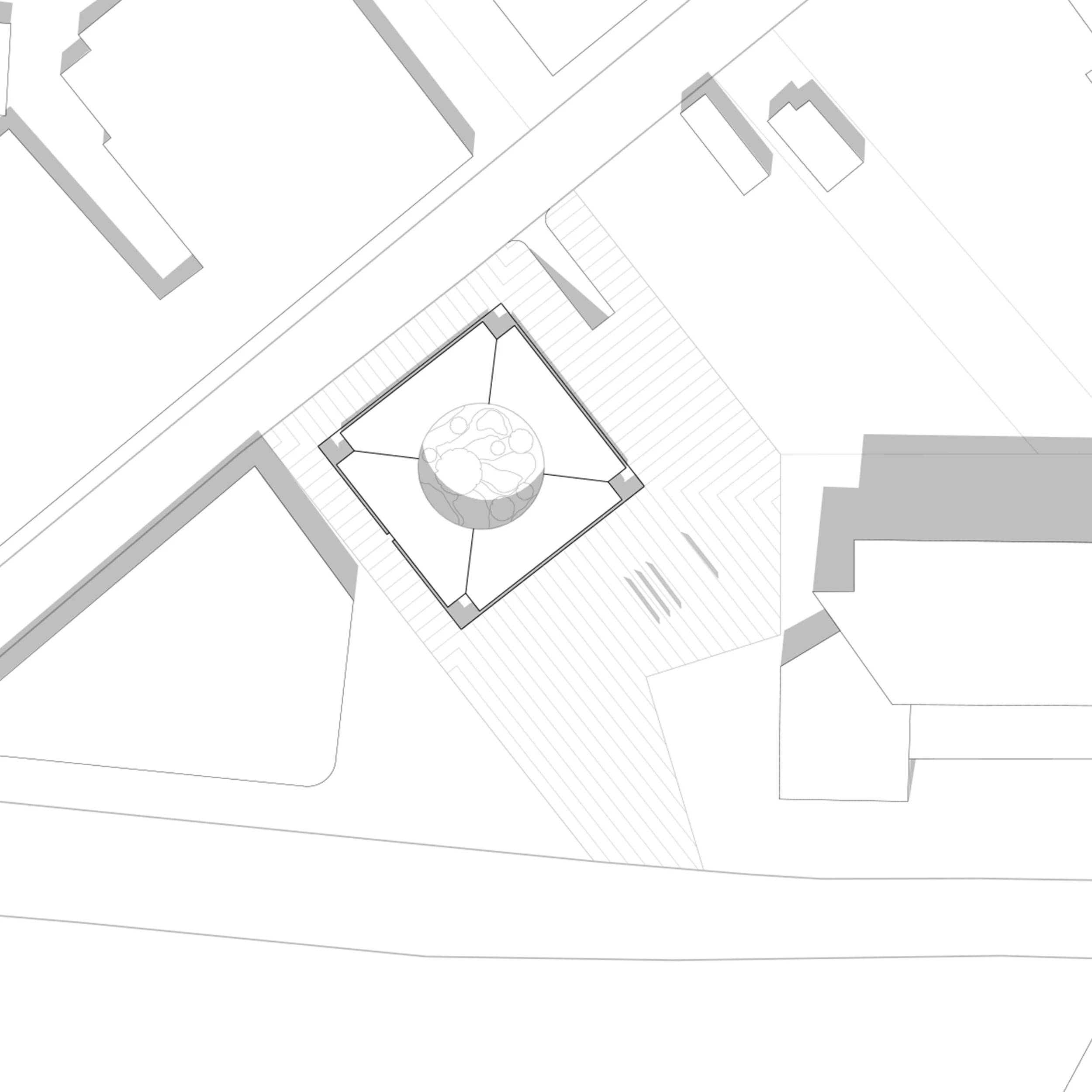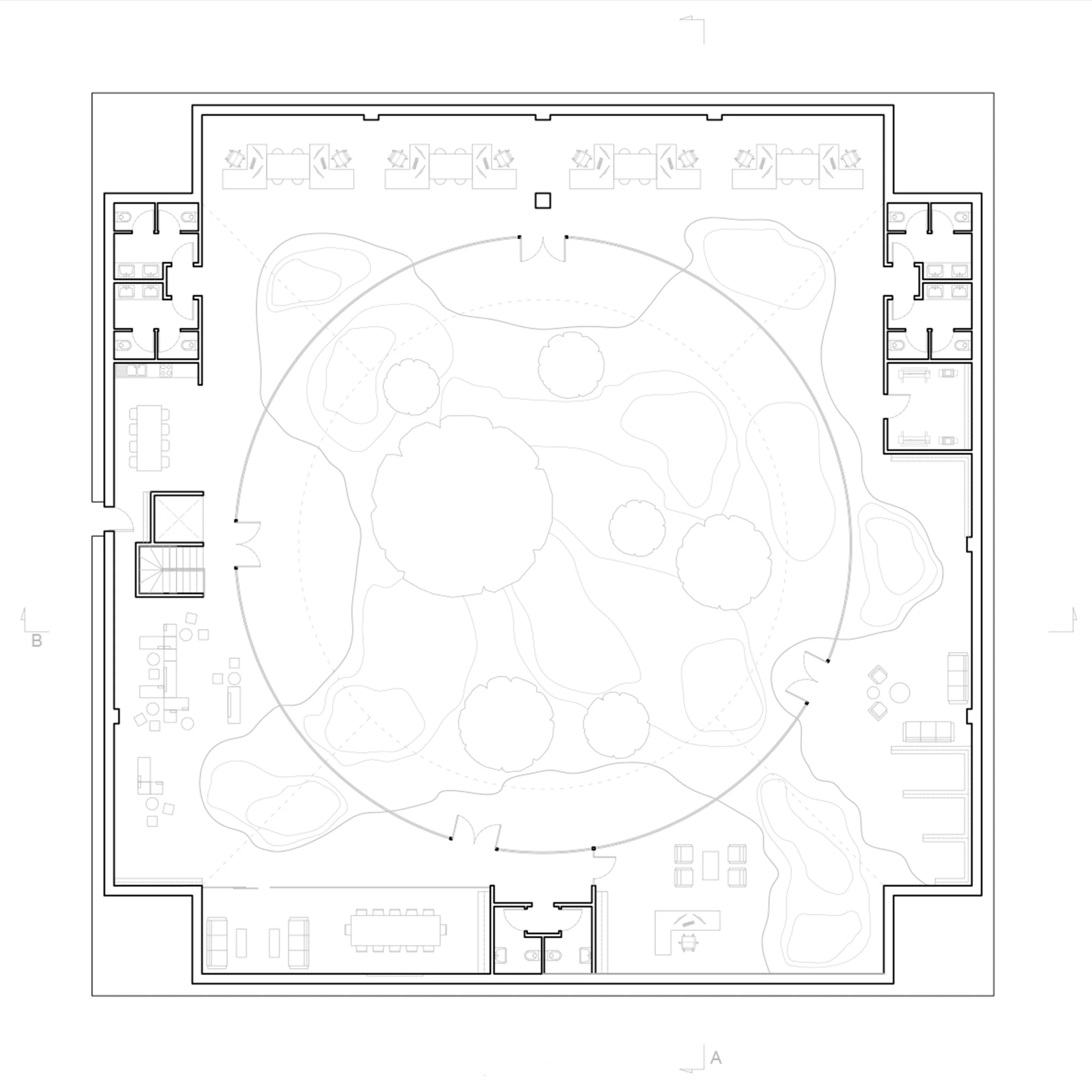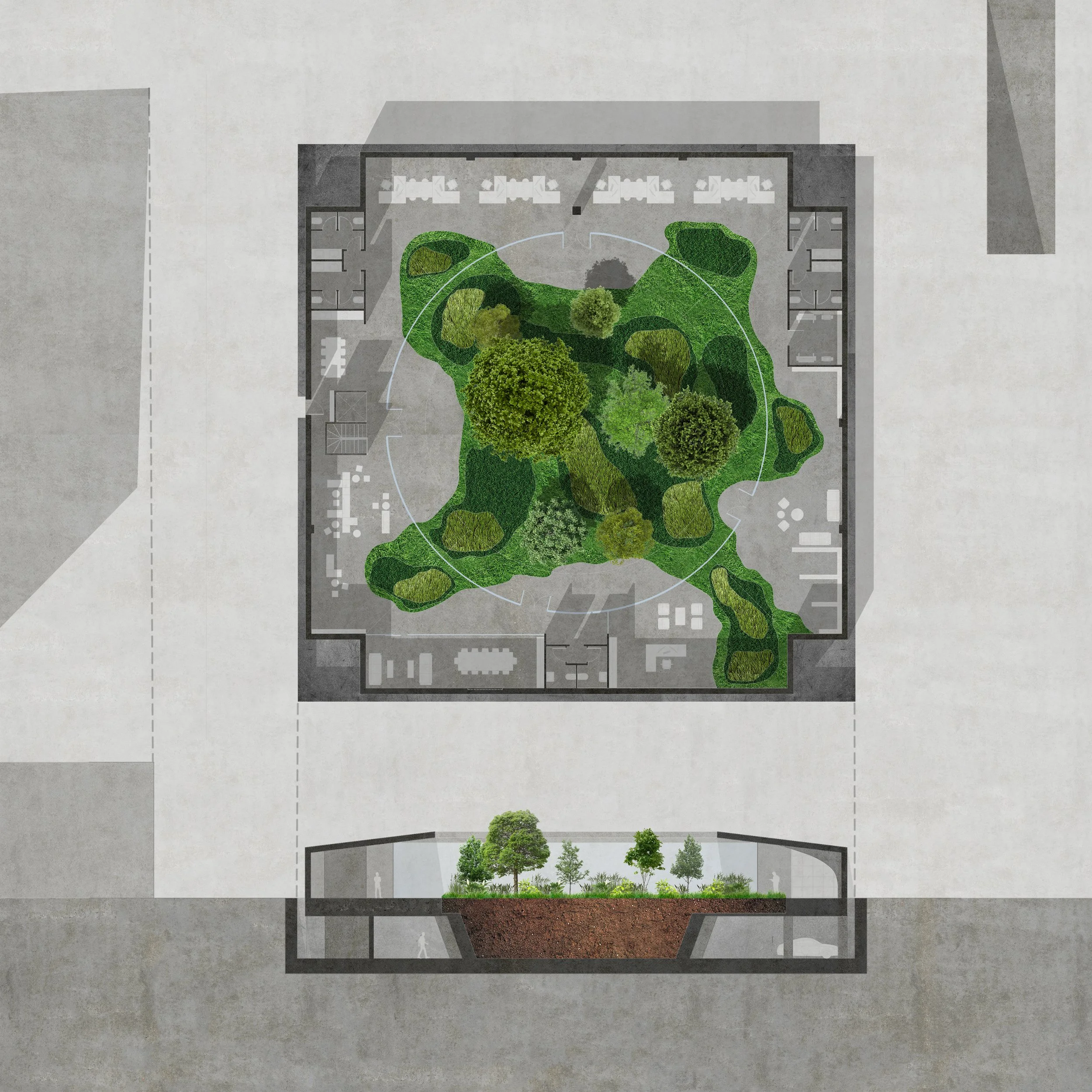 Ufficio di architettura a Bucarest, in pieno centro. L’idea del progetto è di ritagliare uno spazio nella città e creare uno spazio verde attorno al quale l’ufficio si sviluppa, e al quale si fonde. Un altro aspetto importante di questo progetto è l’accesso, che avviene tramite la rampa staccata dall’edificio; si arriva dunque allo spazio interrato e si sale successivamente al piano terra dove ci si trova davanti al giardino con l’unica apertura dell’edificio.